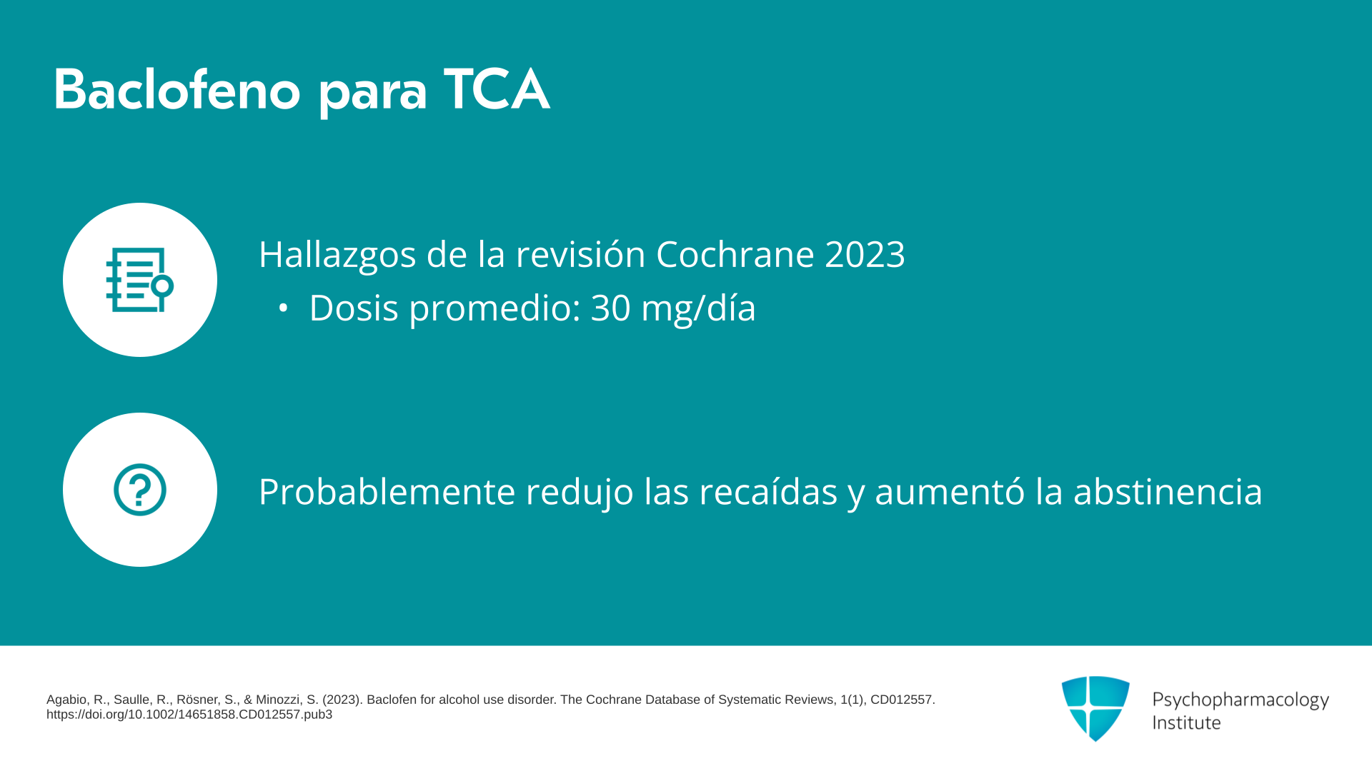 En una revisión Cochrane de 2023, y encuentro que estas revisiones Cochrane a menudo son muy extensas pero conservadoras en sus conclusiones, en un análisis de 17 estudios con menos de 2000 participantes con trastorno por consumo de alcohol, las dosis de baclofeno fueron de 30 mg al día en promedio, y en comparación con placebo, el baclofeno probablemente ayudó a las personas con trastorno por consumo de alcohol a reducir el riesgo de recaída y aumentar el riesgo de días de abstinencia.