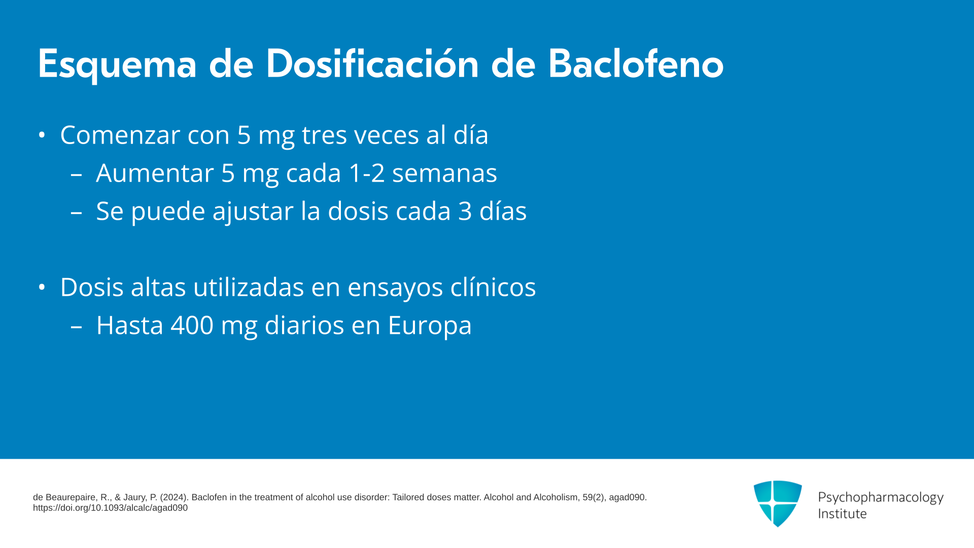 Ahora, la dosificación de baclofeno comienza con aproximadamente 5 mg tres veces al día, y generalmente cada una o dos semanas pueden ajustar eso en 5 mg por dosis. Así que podrían ir a 15 mg al día, luego después de una a dos semanas, 30 mg al día. Pero pueden ajustar tan rápido como cada tres días. Aunque parezca increíble, en ensayos clínicos se han utilizado dosis de hasta 400 mg al día. Personalmente nunca he hecho eso, pero los ensayos clínicos, especialmente en Europa, han respaldado el uso de dosis altas para el tratamiento del trastorno por consumo de alcohol.