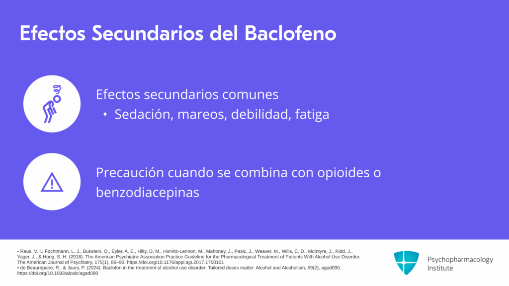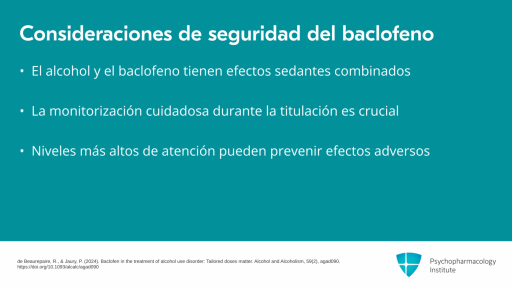 Los efectos sedantes combinados del alcohol y el baclofeno pueden explicar la mayoría de los efectos adversos graves, y por lo tanto en estos estudios, y he incluido uno de de Beaurepaire et al. en 2024, que de hecho sienten que si monitorean cuidadosamente lo que está sucediendo con el alcohol, y proporcionan niveles más altos de atención para prevenir el uso de alcohol durante la titulación de baclofeno, pueden llevarlos a una dosis efectiva sin efectos adversos graves o abandono.