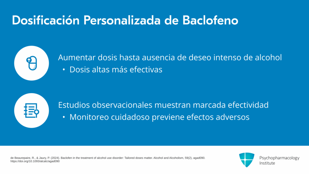 Existe algo llamado dosificación personalizada de baclofeno, que es el uso de estas dosis altas. Aumentan la dosis de baclofeno gradualmente hasta que un paciente siente una ausencia de deseo intenso de alcohol. Ese es el método personalizado y la dosis puede ser bastante variable. Nuevamente, el uso de dosis altas es más efectivo que las dosis bajas. Los estudios observacionales han mostrado consistentemente una marcada efectividad del baclofeno con este enfoque. El análisis de las circunstancias en las que ocurren efectos adversos graves sugiere que un monitoreo cuidadoso de la prescripción de baclofeno podría prevenir una gran mayoría de efectos adversos graves, es decir, visitas más frecuentes, una titulación más cuidadosa para evitar efectos adversos graves.