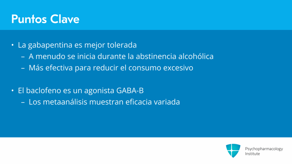 La gabapentina se usa más ampliamente ya que es mejor tolerada, y a menudo se inicia durante el tratamiento de la abstinencia alcohólica. En esos pacientes, parece más efectiva para reducir el consumo excesivo en aquellos con abstinencia alcohólica en comparación con aquellos con abstinencia leve o sin abstinencia. Y finalmente, el baclofeno como agonista GABA-B debería reducir los efectos reforzantes del alcohol, pero los metaanálisis han sido variados en cuanto a respaldar su eficacia como medicamento para el trastorno por consumo de alcohol.