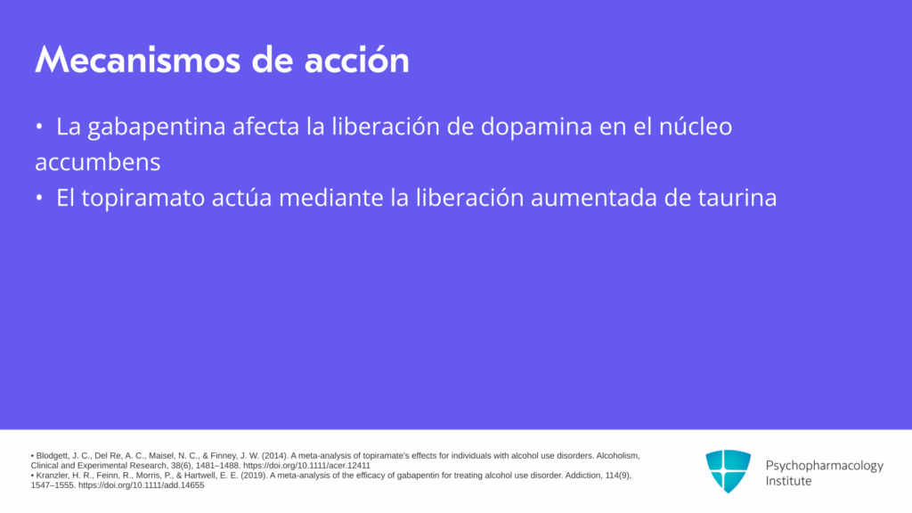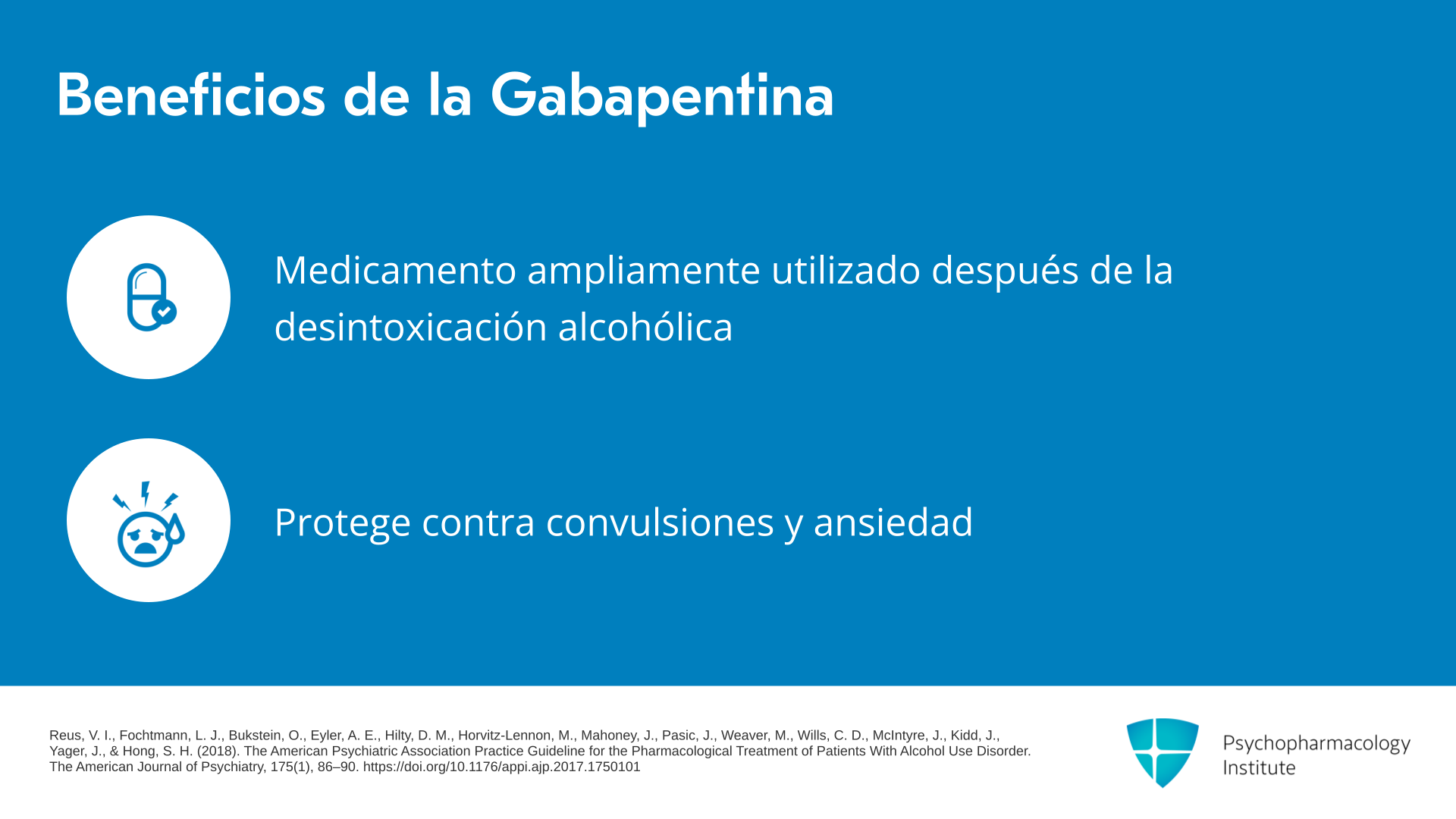 Es importante destacar que, especialmente la gabapentina aquí en Estados Unidos, se usa ampliamente porque las personas suelen venir de la desintoxicación con gabapentina por dos razones. Es antiepiléptica, por lo que debería proteger contra las convulsiones por abstinencia alcohólica. Y dos, es calmante, por lo que trata la ansiedad que acompaña a la abstinencia de alcohol. Por estas dos razones, los pacientes ya llegan a ustedes con gabapentina después de someterse a la desintoxicación.