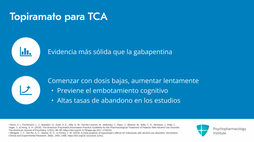 Topiramato. Hablemos primero de este porque, de hecho, la evidencia es un poco más sólida de que es efectivo en el tratamiento del trastorno por consumo de alcohol que para la gabapentina. Necesitan comenzar con dosis bajas y aumentar lentamente. De lo contrario, entra en juego el apodo ‘dopamax’, donde las personas se sienten lentas, cognitivamente embotadas, realmente no les gusta. Y es por eso que muchos estudios de topiramato muestran altas tasas de abandono, porque hubo un aumento demasiado rápido de la dosis.