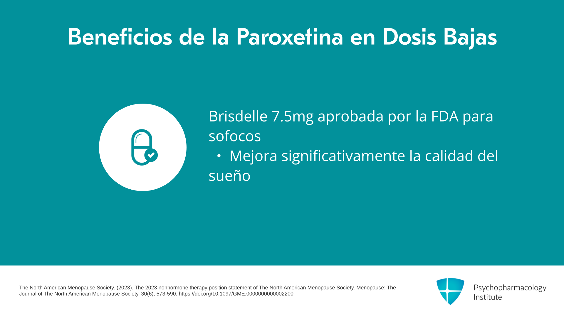 - Para los síntomas vasomotores, la paroxetina en dosis baja de 7.5 mg (Brisdelle) está aprobada por la FDA y mejora la calidad del sueño sin afectar la libido ni el peso.