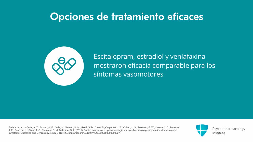 Hubo otro estudio que realizó un análisis combinado de tres ensayos controlados aleatorizados que mostró que 20 mg de escitalopram, 0.5 mg de estradiol oral y 75 mg de venlafaxina diarios resultaron en reducciones comparables de los síntomas vasomotores. Así que todos podrían considerarse buenas opciones para los síntomas vasomotores.