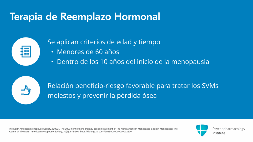 Es importante ahora revisar la declaración de posición de la NAMS sobre la terapia de reemplazo hormonal. En general, para las mujeres menores de 60 años que están dentro de los 10 años del inicio de la menopausia y no tienen contraindicaciones, la relación beneficio-riesgo es favorable para el tratamiento de los síntomas vasomotores molestos y la prevención de la pérdida ósea. Por lo tanto, si alguien está teniendo síntomas vasomotores molestos en la perimenopausia, se debería considerar la terapia de reemplazo hormonal o la terapia hormonal menopáusica.