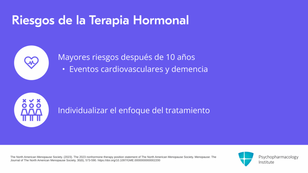 Para las mujeres que inician la terapia hormonal más de 10 años después del inicio de la menopausia o que tienen más de 60 años, la relación beneficio-riesgo parece menos favorable debido a los mayores riesgos absolutos de enfermedad coronaria, accidente cerebrovascular, tromboembolismo venoso y demencia. Es importante individualizar la terapia y tomar decisiones compartidas.