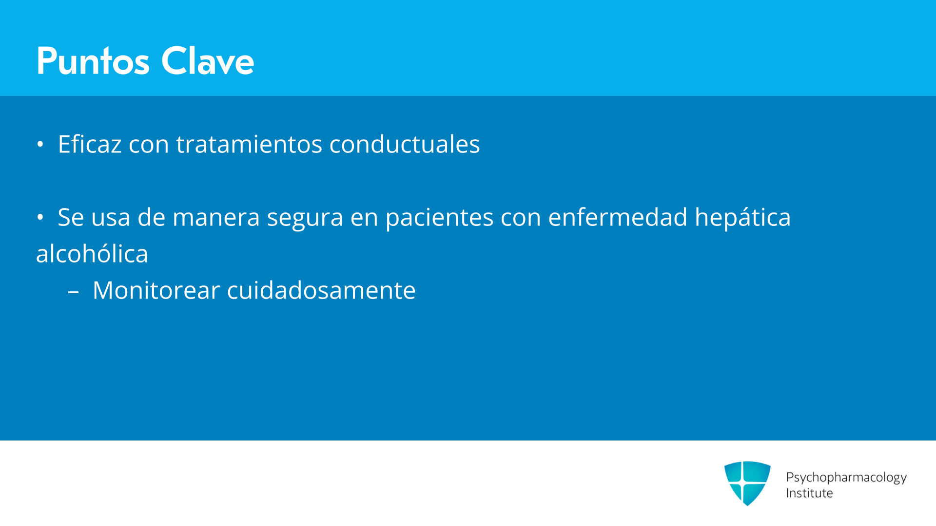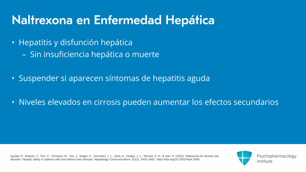 Eviten usar naltrexona si observan que las pruebas de función hepática están cinco veces por encima del límite superior normal, y por supuesto en insuficiencia hepática grave, Child-Pugh Clase C. No digo que descarten el uso de naltrexona cuando tienen pruebas de función hepática elevadas, pero si van a hacerlo, asegúrense de monitorizar muy rápidamente qué está sucediendo con las pruebas de función hepática después de comenzar el tratamiento.