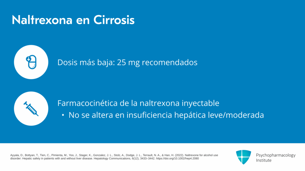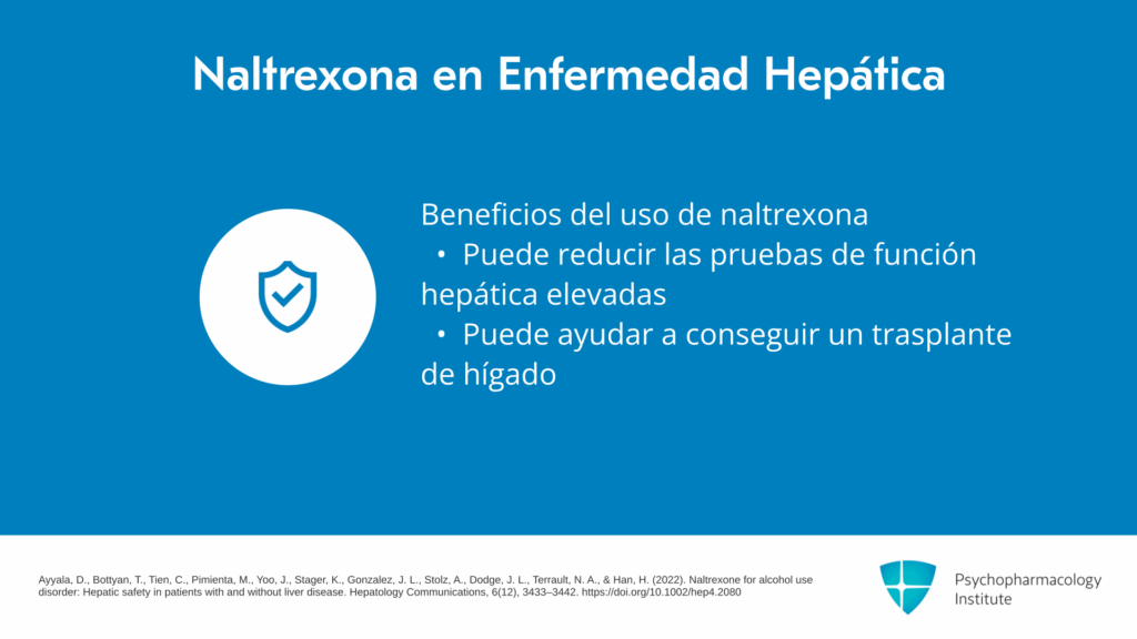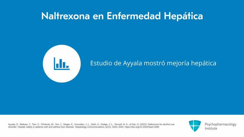 En un estudio de 160 pacientes realizado por Ayyala y colaboradores, el 63% de ellos tenía enfermedad hepática alcohólica, el 30% tenía cirrosis y el 14% tenía cirrosis descompensada. Los tres grupos mostraron mejoría en los valores de AST y ALT con el tratamiento con naltrexona. Por lo tanto, podemos concluir que la naltrexona es segura en aquellos con enfermedad hepática subyacente, incluida la cirrosis compensada, pero yo sería más cuidadoso en la cirrosis descompensada con un monitoreo muy cuidadoso.