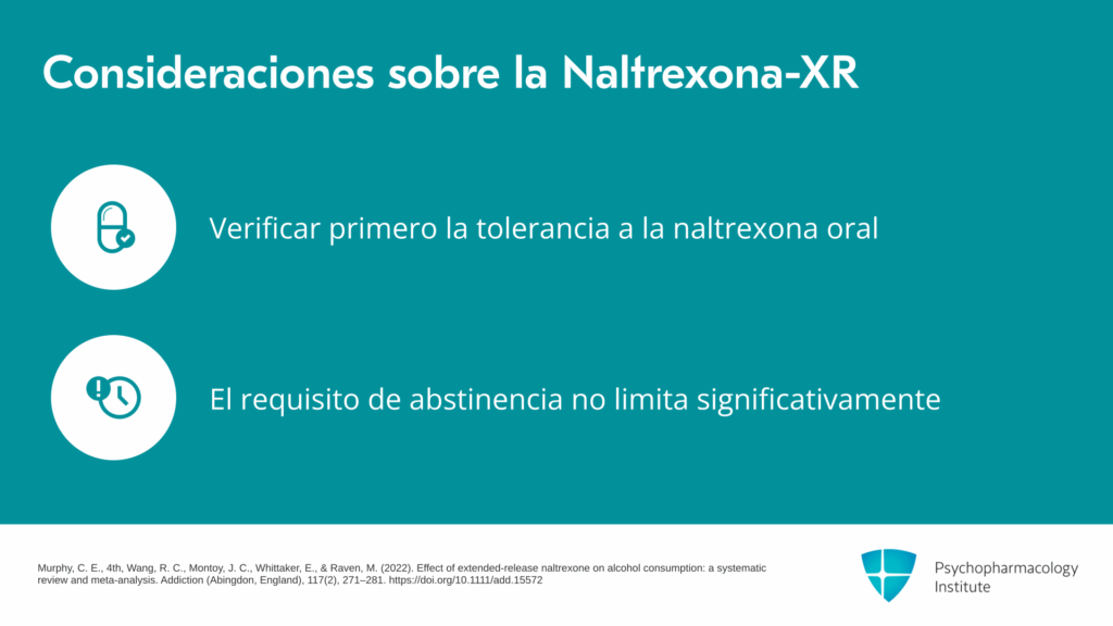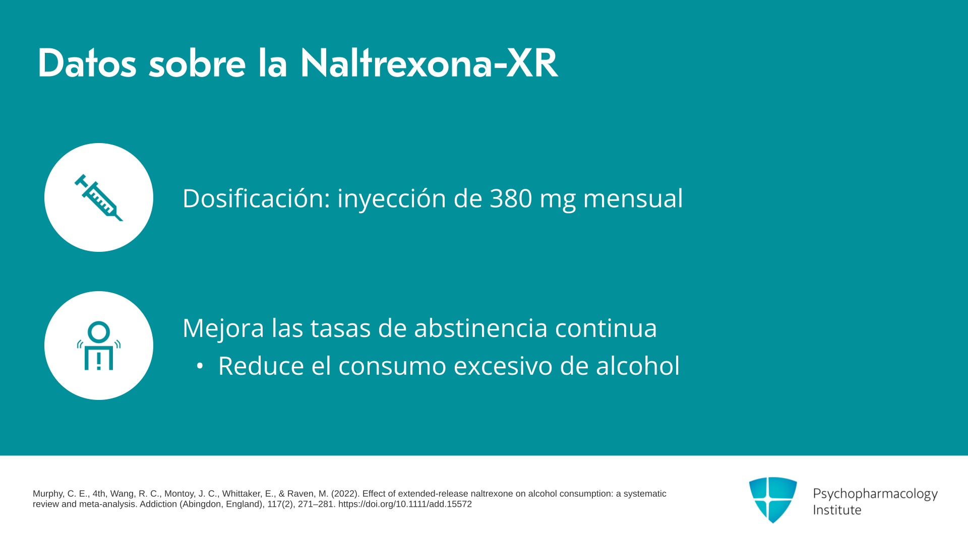 Hablemos sobre la naltrexona de liberación prolongada, que en los Estados Unidos se está utilizando más porque los formularios se están volviendo menos restrictivos. En 2006, la primera naltrexona inyectable fue aprobada para el tratamiento del trastorno por consumo de alcohol. Es una inyección de 380 mg que se administra en el músculo glúteo profundo cada cuatro semanas, y tienden a alternar los lados. Bloquea los receptores de opioides durante un mes completo y sus efectos sobre el consumo excesivo de alcohol son mayores en aquellos con al menos cuatro días de abstinencia antes del inicio del tratamiento. Y en este grupo, el tratamiento mejoró las tasas de abstinencia continua y también redujo el consumo excesivo.