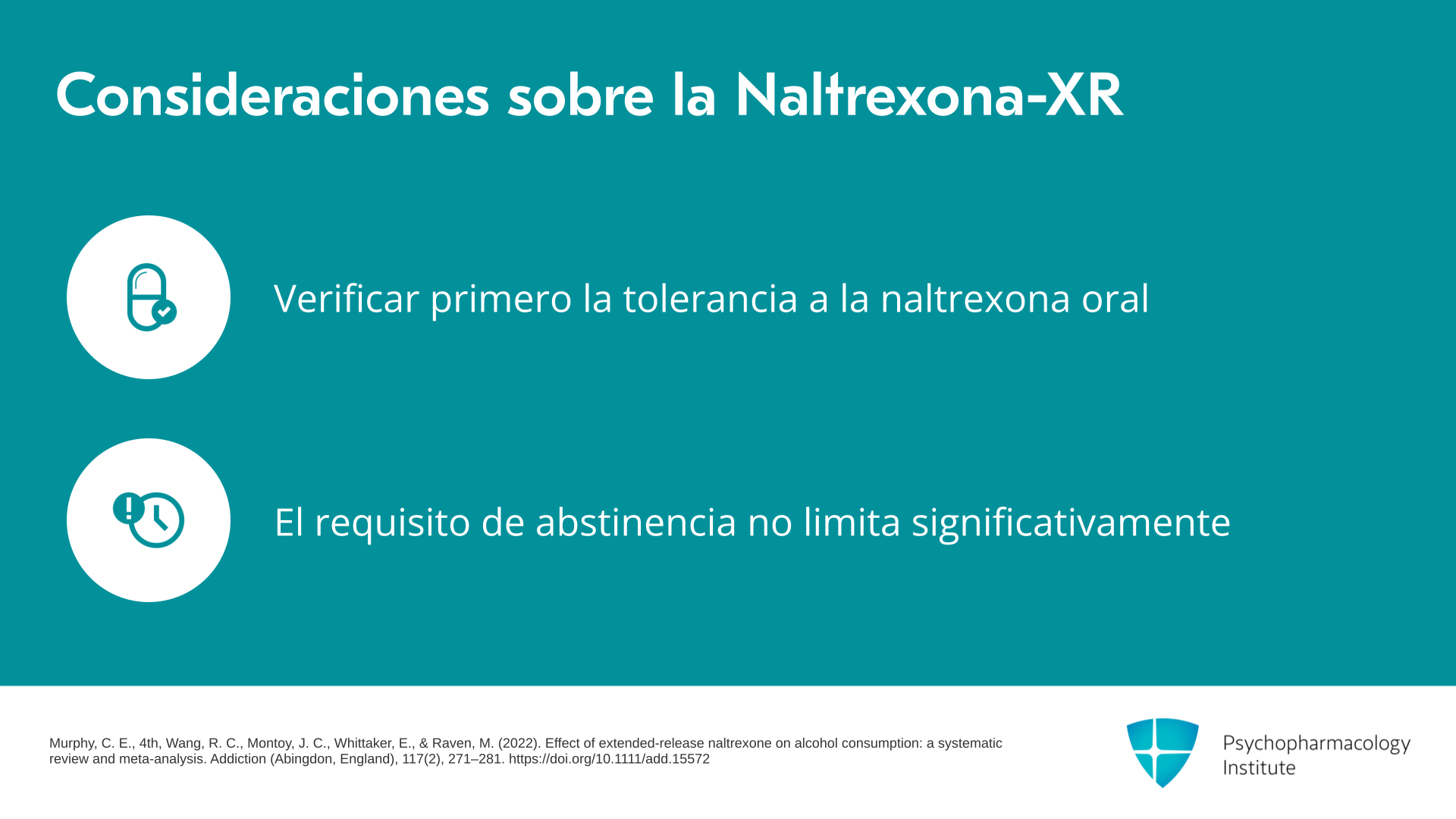 Ahora, vamos a hablar sobre la naltrexona para el manejo del trastorno por consumo de alcohol. Este es, al menos en los Estados Unidos, el recurso más potente, el medicamento más ampliamente utilizado.