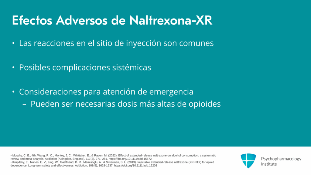 Efectos adversos. Es un volumen bastante grande para inyectar, por lo que se producen reacciones en el sitio de la inyección. Pueden presentarse náuseas y vómitos, pero menos que con la forma oral. Pueden provocar abstinencia a opioides precipitada en aquellos que eran dependientes. Nuevamente, depresión, elevación de las pruebas de función hepática. Si alguien va a una sala de emergencias, por ejemplo, habiéndose roto un brazo y está con la inyectable, debería estar en un entorno médicamente monitoreado porque para anular el bloqueo probablemente necesitarían usar dosis más altas del opioide.