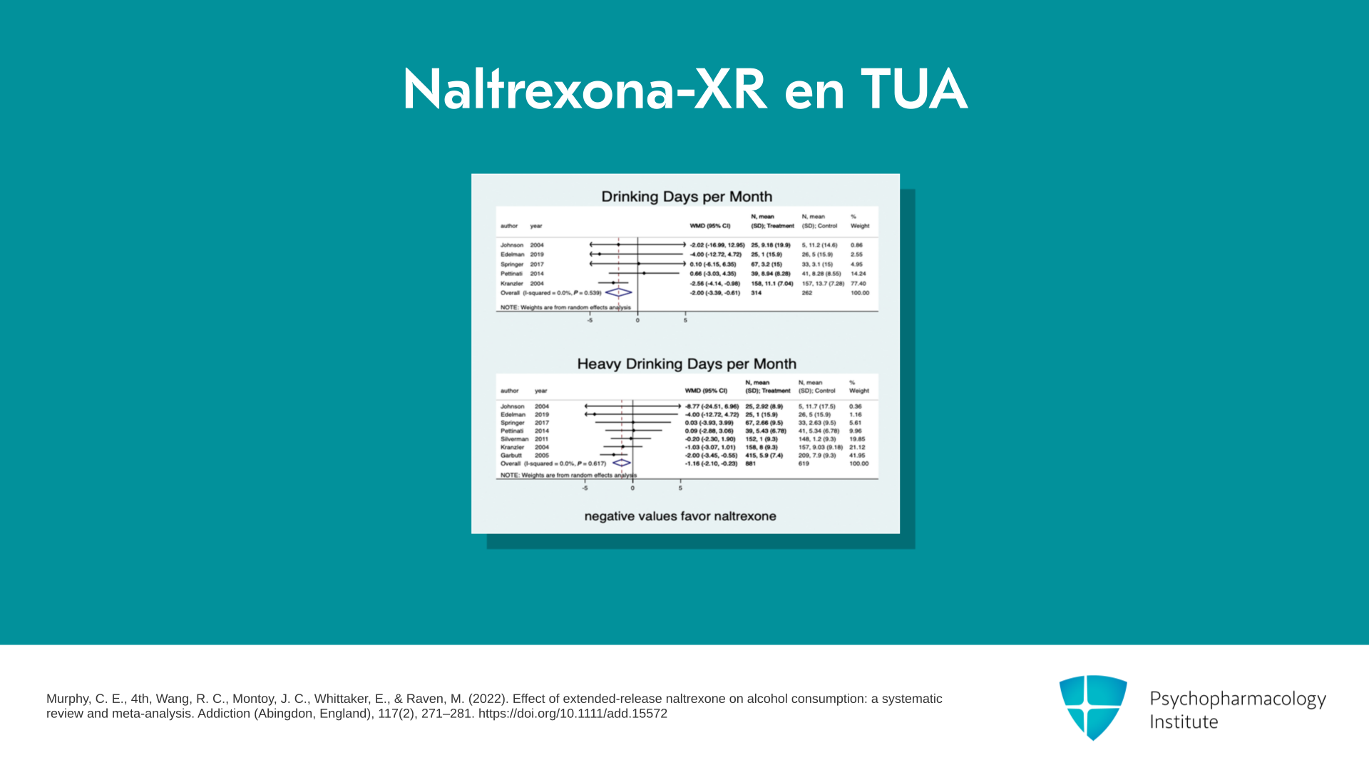 La siguiente diapositiva muestra un buen metaanálisis de Murphy y colaboradores que muestra los tamaños del efecto para la reducción de días de consumo excesivo de alcohol. Tanto los días de consumo como los días de consumo excesivo se reducen moderada y significativamente con la naltrexona de liberación prolongada.