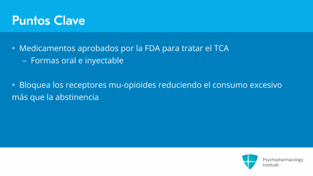 Así que los puntos clave en esta sección: La naltrexona oral e inyectable son medicamentos aprobados por la FDA para tratar el trastorno por consumo de alcohol, y de hecho son los agentes más ampliamente utilizados. La naltrexona bloquea los receptores mu-opioides y así reduce los efectos gratificantes del alcohol, reduciendo más el consumo excesivo que la abstinencia.