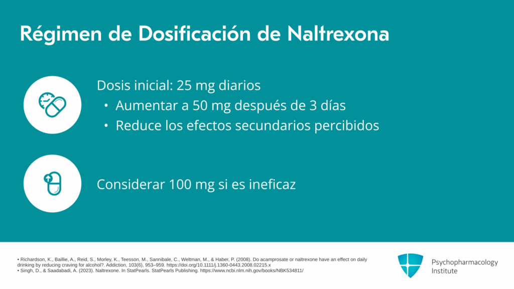 La naltrexona puede iniciarse con una dosis diaria de 25 mg y después de tres días aumentarse a 50 mg. Hay muchas personas que comienzan directamente con 50 mg, pero he observado que este régimen de dosificación alivia los problemas estomacales y reduce cualquier efecto secundario percibido. Si la naltrexona no es efectiva, tan pronto como a los siete días pueden aumentar la dosis a 100 mg. En realidad, rara vez veo que esto se haga. Las personas tienden a mantenerse en 50 mg y agregar otros medicamentos. Pero si el hígado está funcionando bien y están obteniendo un efecto parcial con la naltrexona, deberían considerar aumentar la dosis.