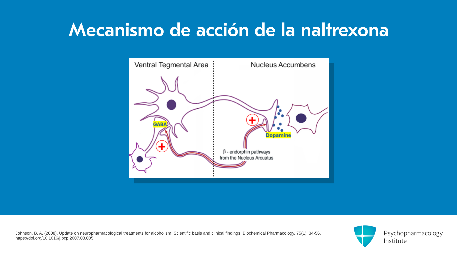 La naltrexona oral fue aprobada por la FDA en Estados Unidos en 1994 con base en la reducción del consumo excesivo de alcohol, no en la abstinencia. Su mecanismo consiste en bloquear la liberación de opioides endógenos en respuesta al consumo de alcohol, reduciendo así los efectos gratificantes del alcohol. Los efectos son mayores cuando el deseo de consumir es prominente, probablemente porque en todas las sustancias de abuso, es la fase anticipatoria del consumo la que realmente resulta en una mayor liberación de dopamina que cuando estamos consumiendo la sustancia. Y esto también es cierto para el alcohol.