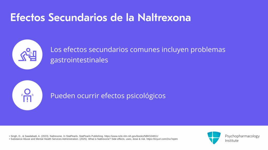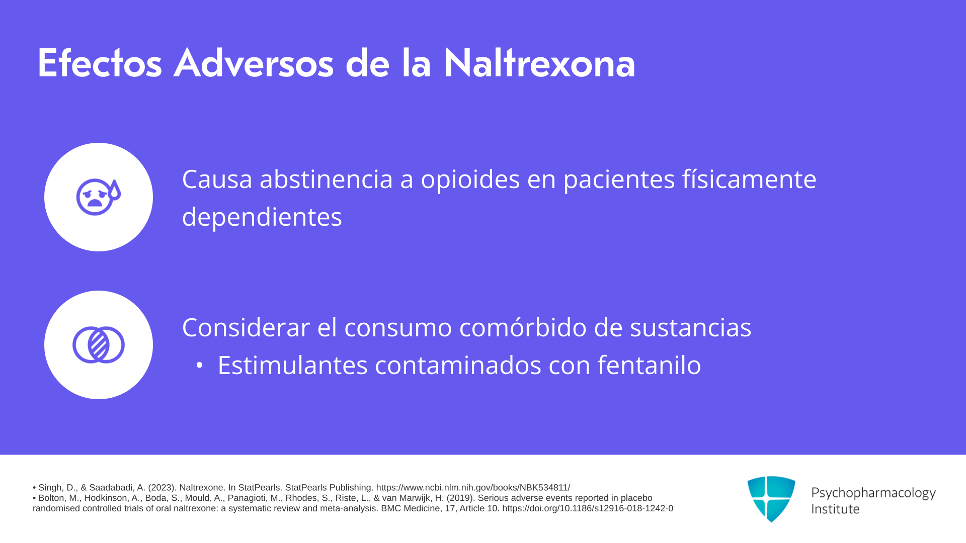 Naltrexona oral. ¿Cuáles son sus efectos adversos? Administrar naltrexona como bloqueador de opioides causará síndrome de abstinencia a opioides en aquellos que son físicamente dependientes de los opioides. Por lo tanto, asegúrense de que su paciente no esté esperando usar opioides según sea necesario o mantenerse en terapia con opioides a largo plazo. Y curiosamente, asegúrense de que, dado que la comorbilidad del trastorno por consumo de opioides y el trastorno por consumo de alcohol está definitivamente presente, si alguien está usando incluso metanfetamina y cocaína, que en los Estados Unidos casi siempre están contaminadas con fentanilo, asegúrense de que no exista el riesgo de inducir abstinencia a opioides cuando pongan a alguien en este tratamiento.