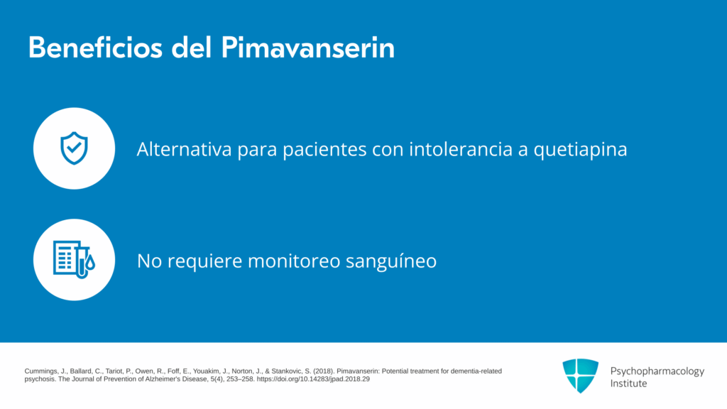 Y algunas personas podrían preguntar, ¿hay alguna ventaja en usar pimavanserin sobre quetiapina en el tratamiento de alucinaciones asociadas con la enfermedad de Parkinson? Creo que puede ser útil para pacientes que aún desarrollan efectos secundarios extrapiramidales con quetiapina o tienen sedación excesiva con ese medicamento. También evita el monitoreo sanguíneo requerido con Clozaril.