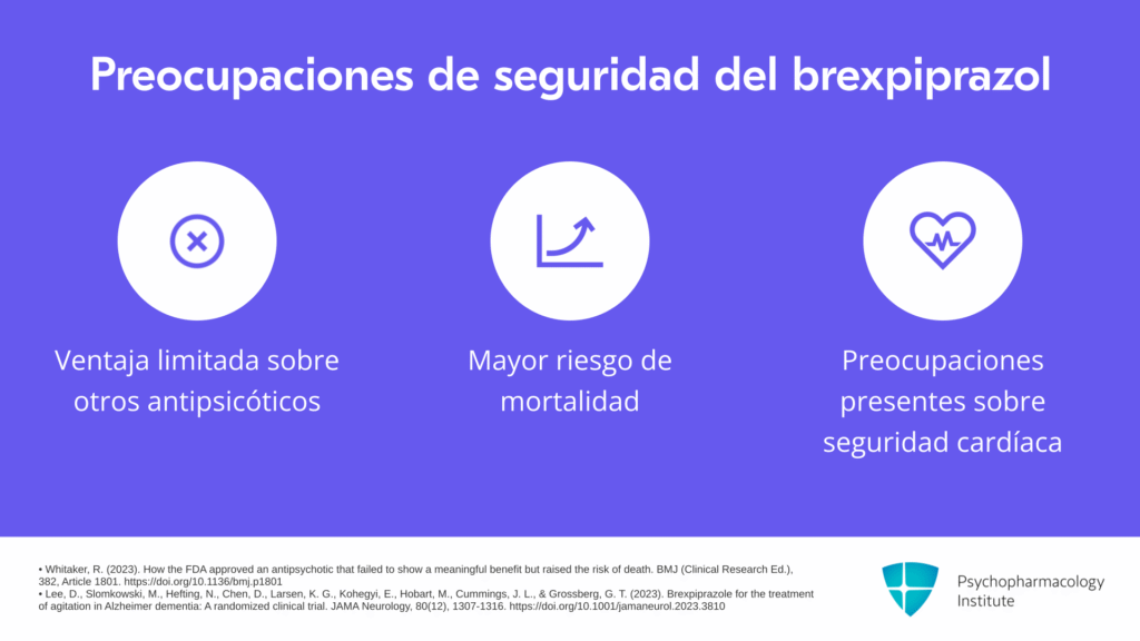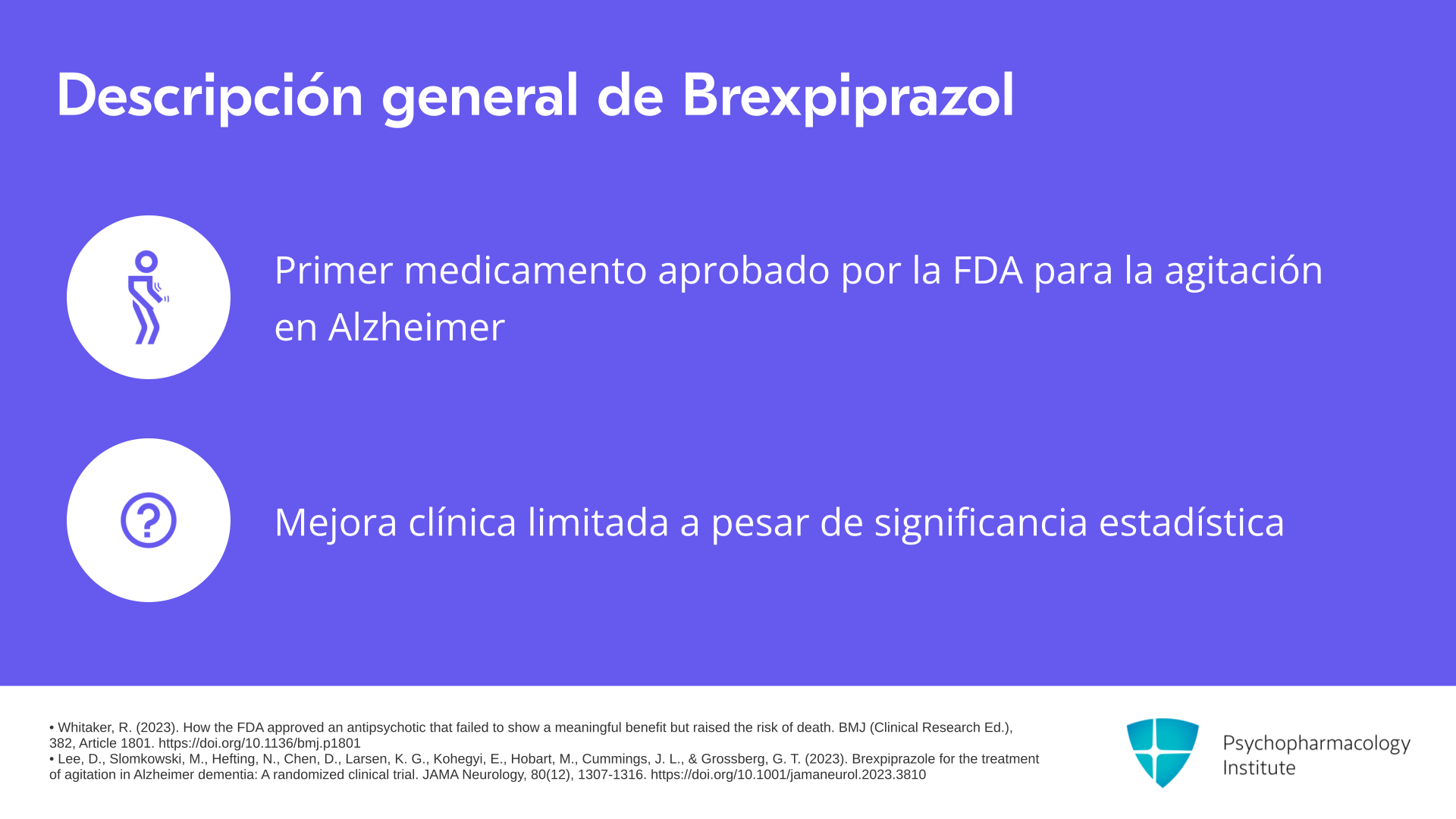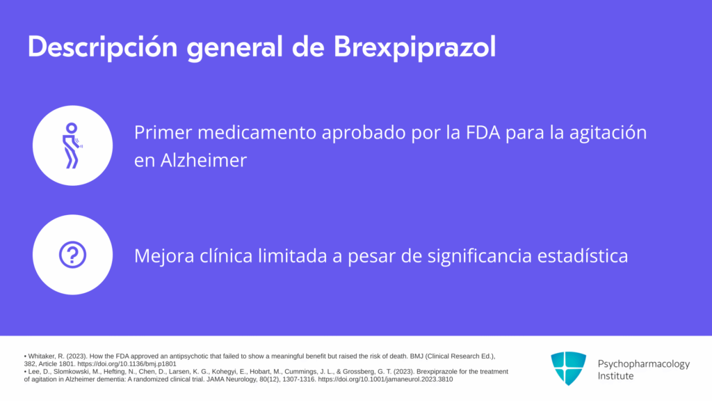 • El brexpiprazol está aprobado por la FDA para la agitación en la enfermedad de Alzheimer, pero ofrece beneficios modestos y se asocia a riesgos significativos de mortalidad.