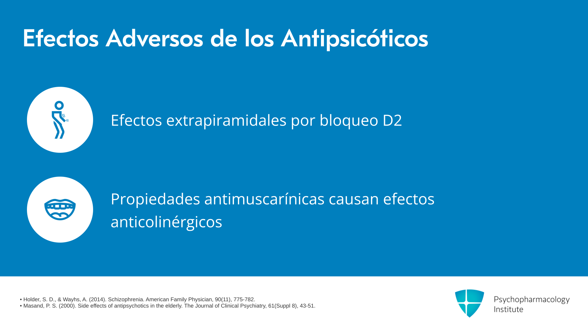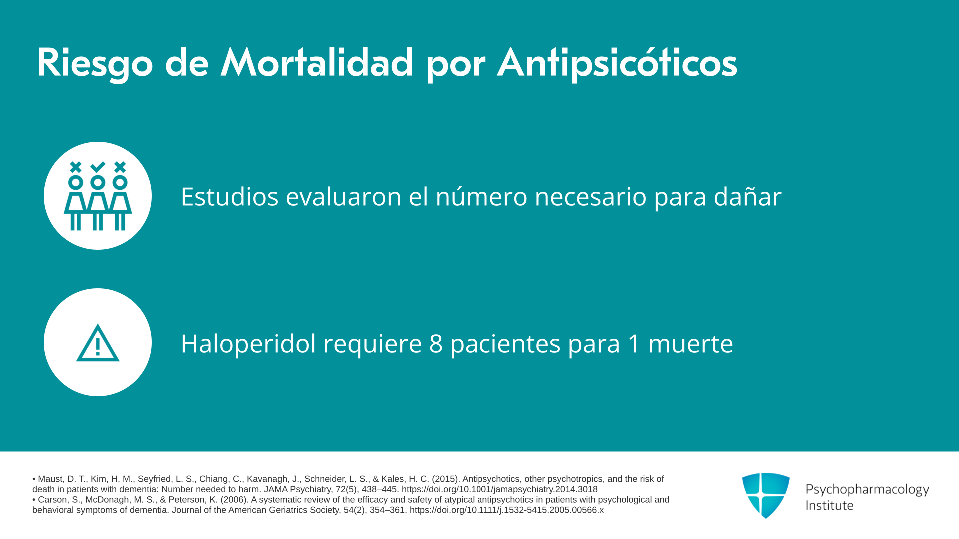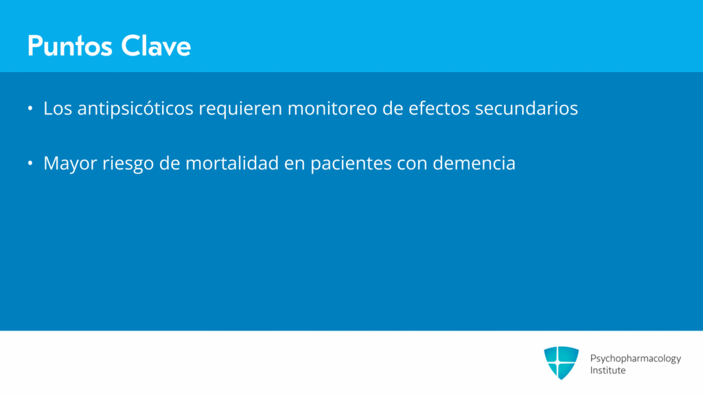 Algunos puntos clave para esta sección: Los antipsicóticos vienen con una serie de efectos secundarios, incluidos efectos metabólicos, prolongación del intervalo QT y alteraciones motoras que deben ser monitoreados. Los antipsicóticos están asociados con un mayor riesgo de mortalidad cuando se utilizan para tratar la psicosis relacionada con la demencia.