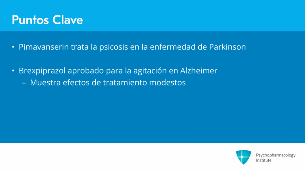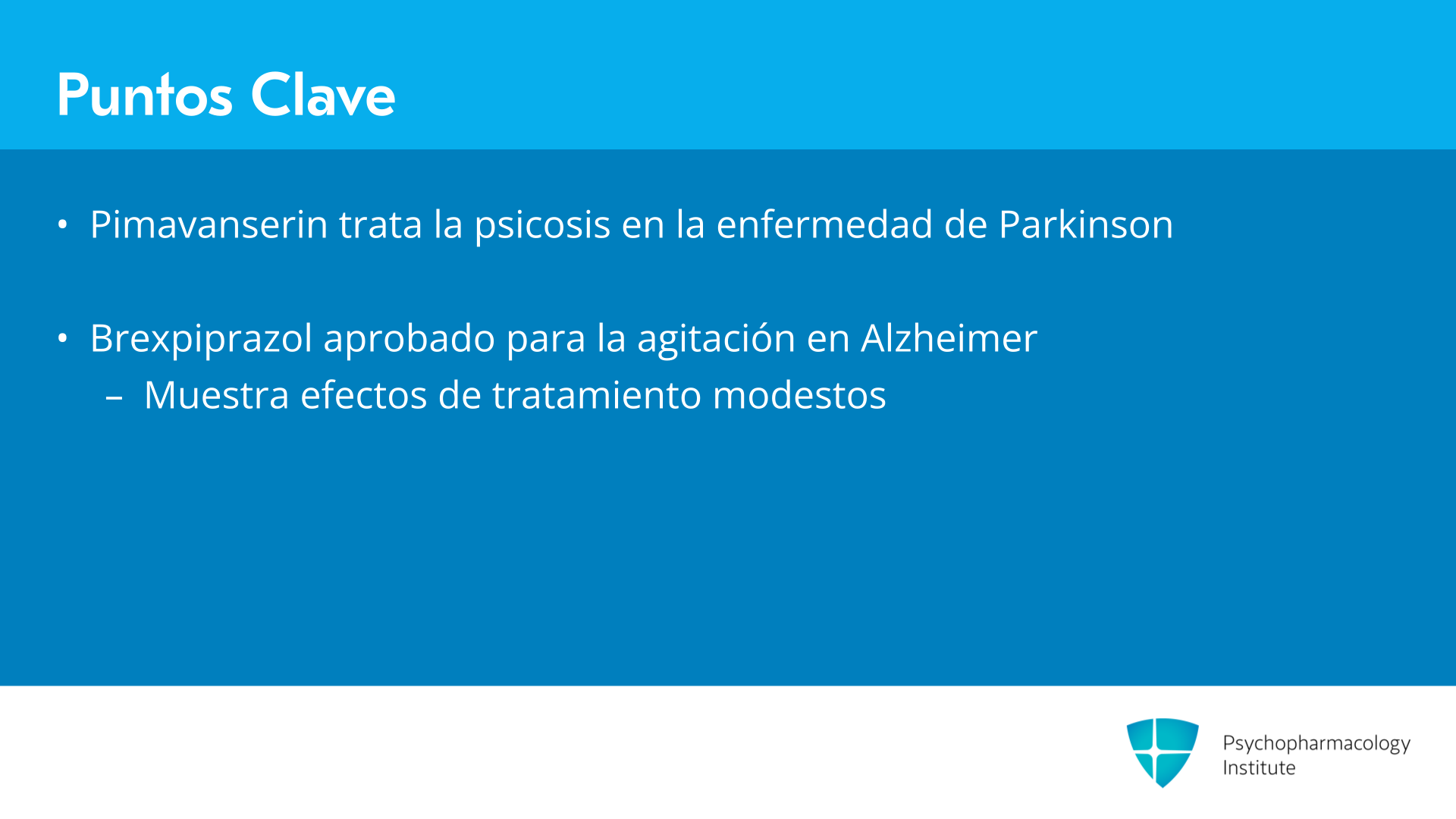 Pimavanserin es un antipsicótico novedoso indicado para tratar la psicosis asociada con la enfermedad de Parkinson, pero lleva la misma advertencia de caja negra por mayor riesgo de mortalidad. Brexpiprazol es el primer antipsicótico aprobado por la Administración de Alimentos y Medicamentos de EE. UU. para el tratamiento de la agitación asociada con la enfermedad de Alzheimer. Sin embargo, el efecto del tratamiento es modesto.