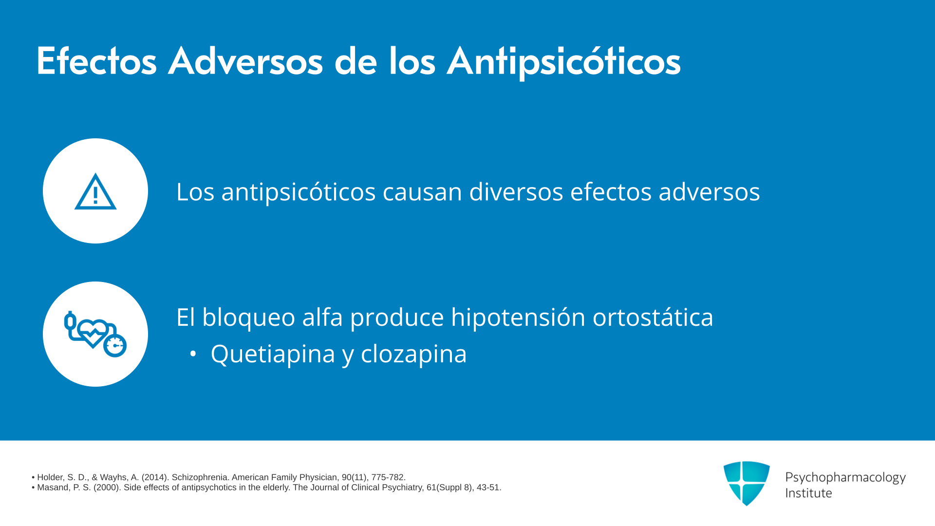 Sabemos que los antipsicóticos vienen con una variedad de efectos adversos. Algunos de estos medicamentos pueden causar bloqueo alfa, lo que puede provocar hipotensión ortostática. Esto podría ocurrir con medicamentos como la quetiapina o la clozapina.
