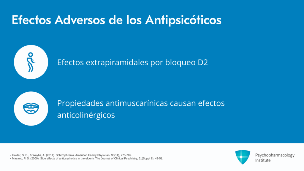 Los medicamentos también pueden tener importantes efectos extrapiramidales relacionados con el bloqueo D2, que pueden provocar alteraciones de la marcha, rigidez motora, temblor, acatisia y discinesia tardía. Muchos de estos medicamentos tienen propiedades antimuscarínicas, que pueden provocar efectos secundarios anticolinérgicos.