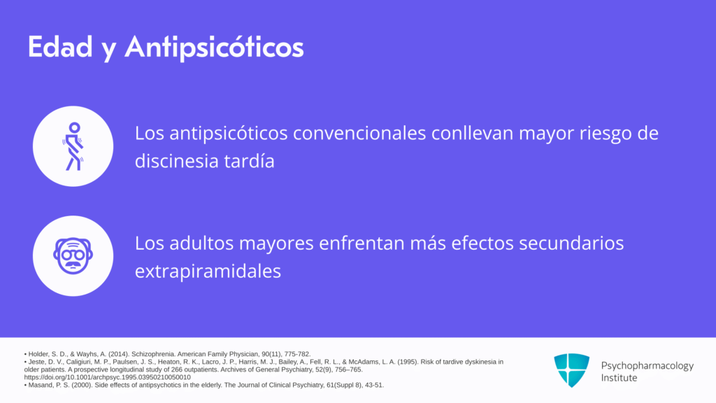 Cuando analizamos la incidencia anual acumulada de discinesia tardía con antipsicóticos convencionales, sabemos que el uso de estos medicamentos en adultos mayores está asociado con un mayor riesgo de discinesia tardía. Por lo tanto, estos efectos secundarios extrapiramidales o la discinesia tardía son más probables en adultos mayores.