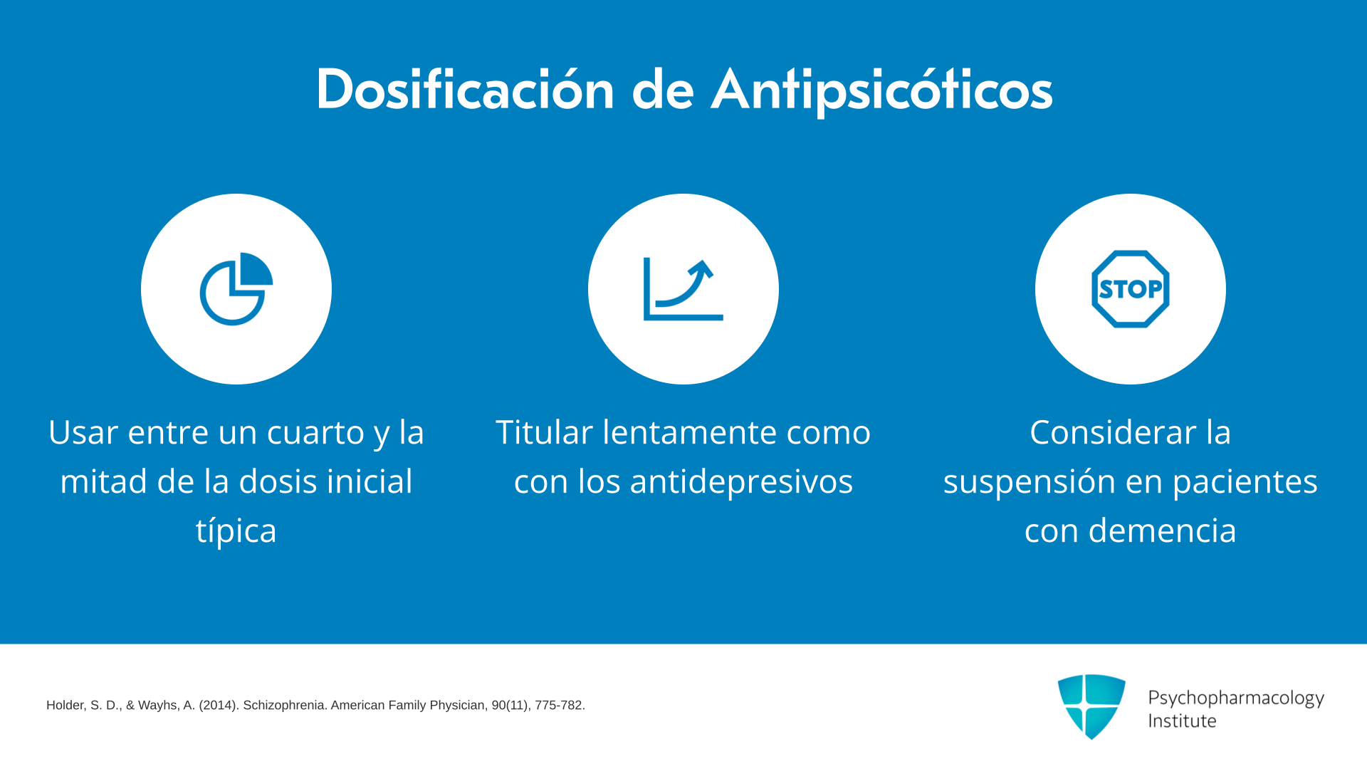 • Al prescribir antipsicóticos en adultos mayores, considere el enfoque de “empiece bajo, avance lentamente y quizá suspenda”, especialmente en pacientes con demencia.