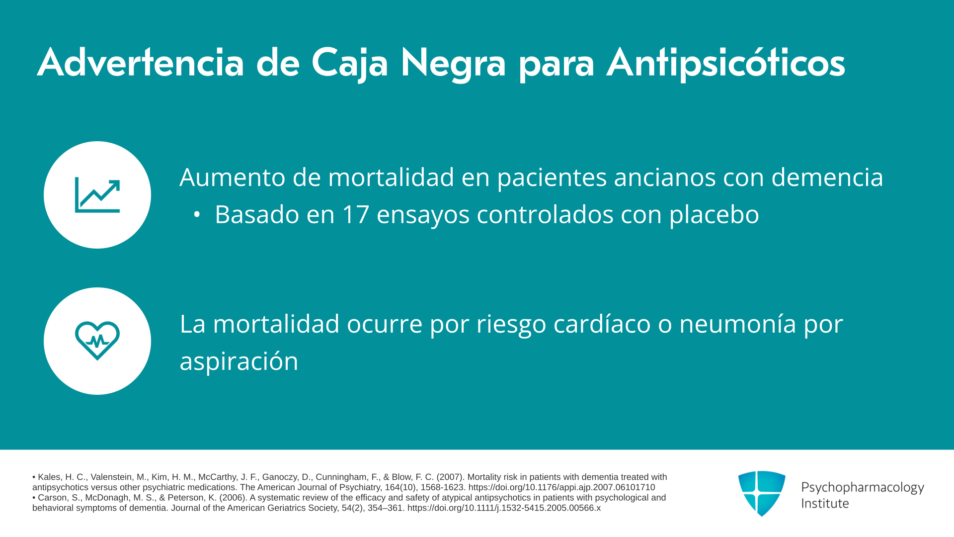 En la demencia, sabemos que existe una advertencia de caja negra para los antipsicóticos y que están asociados con un aumento de la mortalidad cuando se utilizan para el tratamiento de trastornos conductuales en pacientes ancianos con demencia. Esto se basa en un análisis de 17 ensayos controlados con placebo con olanzapina, quetiapina, risperidona y aripiprazol. Se encontró que el uso de estos medicamentos está asociado con un aumento de 1.6 a 1.7 veces en la mortalidad. Sabemos que estos medicamentos pueden ser muy útiles para algunos pacientes con alteraciones conductuales en la demencia, pero conllevan este efecto secundario de mortalidad y riesgo. Esto se debe generalmente a riesgo cardíaco, accidente cerebrovascular o un evento de aspiración como una neumonía por aspiración.