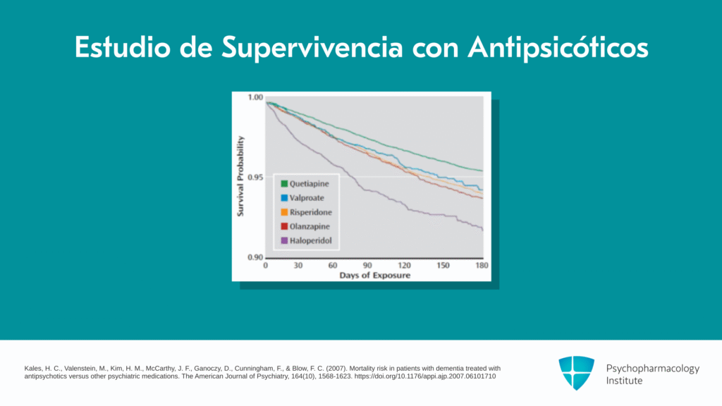 En un estudio realizado por Helen Kales, se analizó la supervivencia después de estar recién expuesto a un medicamento antipsicótico y pueden ver estas curvas de supervivencia disminuyendo después del inicio. Un poco peor para medicamentos como haloperidol y olanzapina. Quizás un poco mejor con medicamentos como quetiapina.