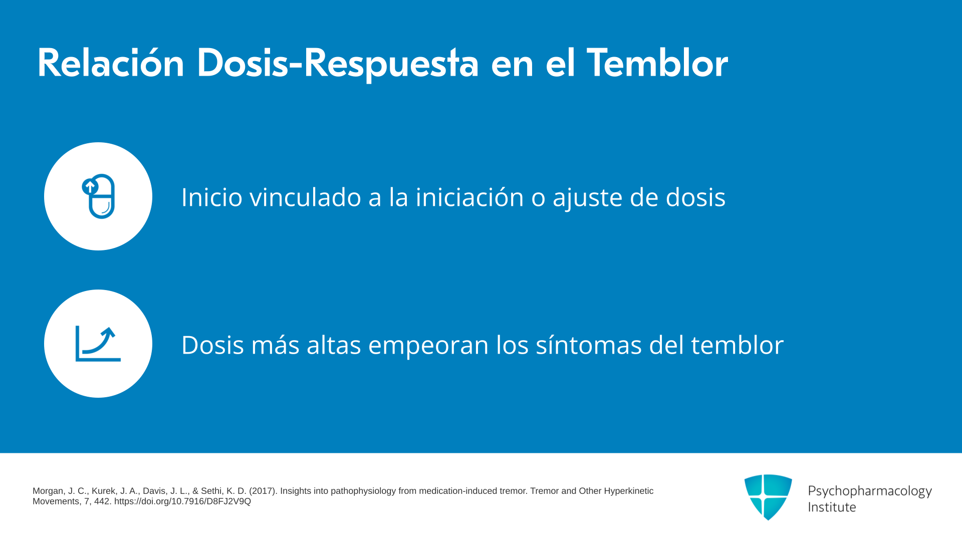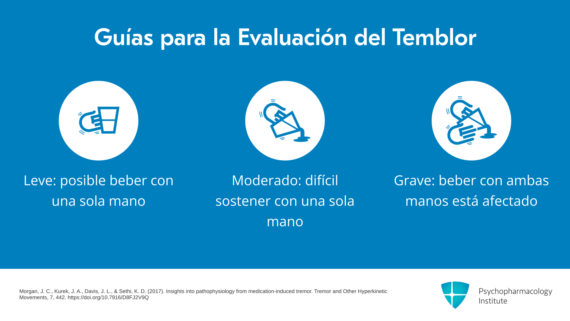 ¿Cómo tratan un temblor inducido por medicamentos? Aunque existen varias evaluaciones para clasificar la gravedad del temblor, probablemente hay una heurística más simple en términos de determinar cuándo tratar. Si pueden beber de un vaso con una sola mano, ese temblor es leve. Y dependiendo del paciente, puede que necesiten o quieran tratarlo o no. Un temblor de gravedad más moderada es cuando sostener un vaso con una mano es difícil. Y luego el grave es cuando beber es difícil o tal vez incluso imposible, incluso usando las dos manos. Así que esa es una buena regla general para determinar cuándo tratar y cuán agresivamente hacerlo.