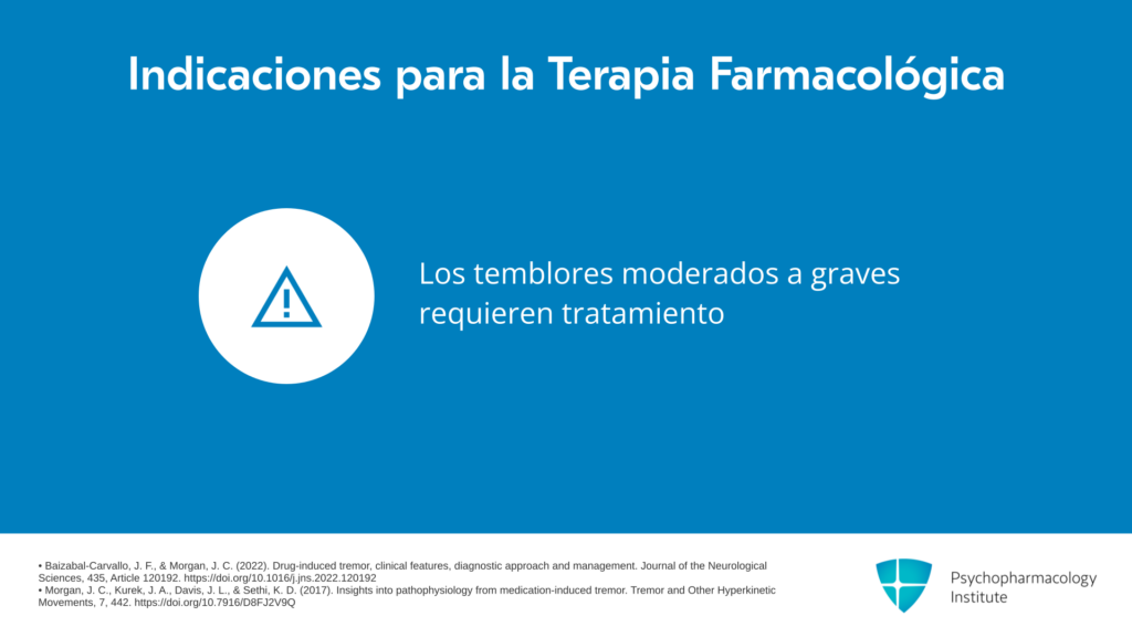 La terapia farmacológica a menudo es necesaria para los temblores moderados y graves porque ahora está interfiriendo con la función, especialmente si no pueden reemplazar el agente causal. El síntoma de interés es tan incapacitante o angustiante que realmente no pueden encontrar otra alternativa.