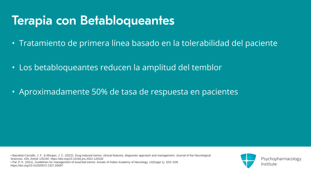 - Los betabloqueadores son el tratamiento de primera línea, reduciendo la amplitud del temblor con una tasa de respuesta aproximada del 50%. Inicie propranolol con 10 mg/día en dosis divididas, con un rango terapéutico de 60–320 mg/día.