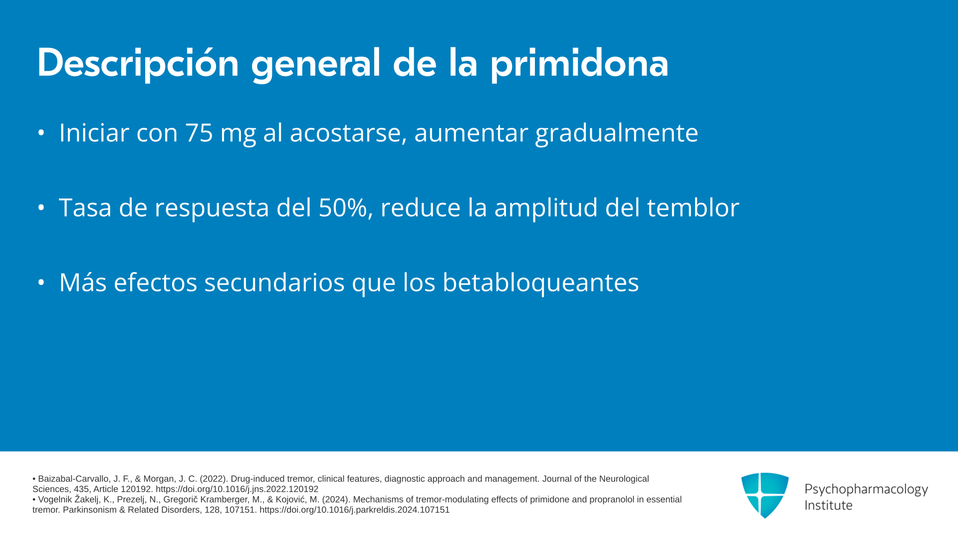 Otra opción es la primidona. La primidona a 75 mg al acostarse es generalmente un buen punto de partida, y luego pueden aumentar hasta que el temblor de interés haya mejorado, o hayan alcanzado aproximadamente 250 mg por día. La tasa de respuesta es similar a la de los betabloqueantes. Tal vez alrededor del 50% de las personas responderán. Reduce la amplitud pero no la frecuencia del temblor. Es un poco más probable que cause efectos secundarios que los betabloqueantes. Pueden obtener ataxia, sedación, vértigo, fatiga y náuseas. Así que generalmente debido a este mayor riesgo de efectos adversos, se considera de segunda línea.
