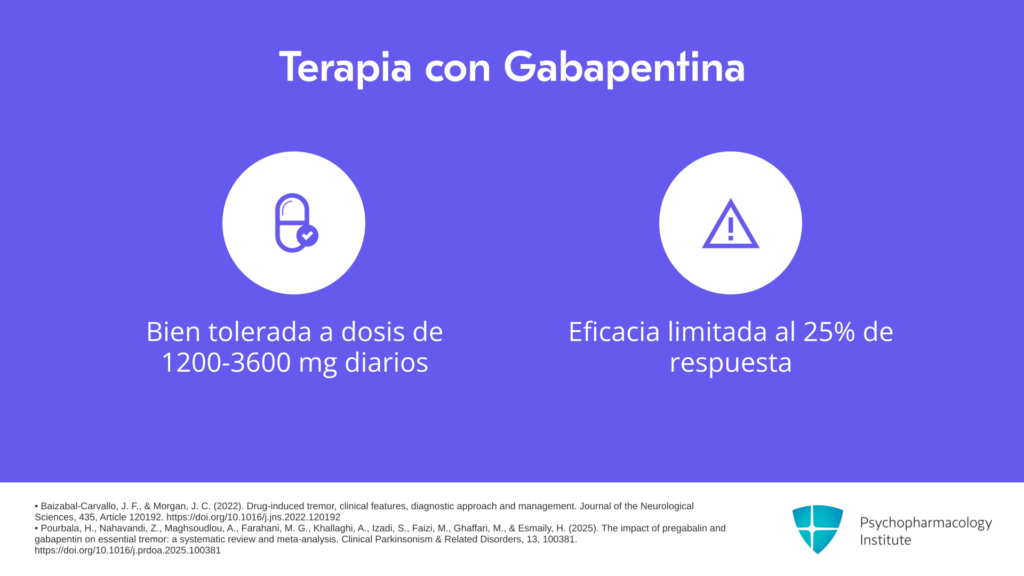 - La gabapentina (1200–3600 mg diarios) es bien tolerada, pero presenta una tasa de respuesta cercana al 25%.