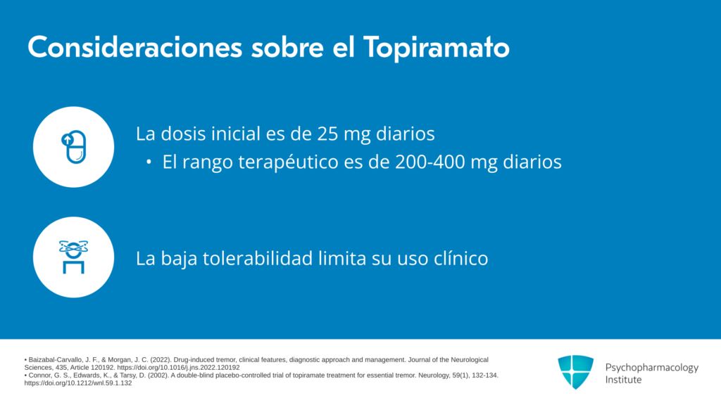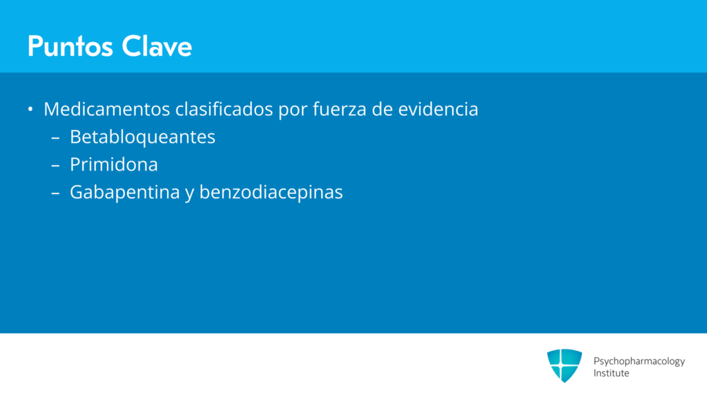 Con el propranolol, que es el recomendado, generalmente comienzan con una dosis baja de 10 mg por día en dosis divididas. Tiene una vida media bastante corta. Pero el rango terapéutico en dosis divididas puede estar entre 60 y 320 mg por día. Así que especialmente en los rangos más altos, deben estar atentos a los efectos secundarios que pueden incluir fatiga, disminución de la frecuencia cardíaca, porque es un betabloqueante, y disfunción eréctil.