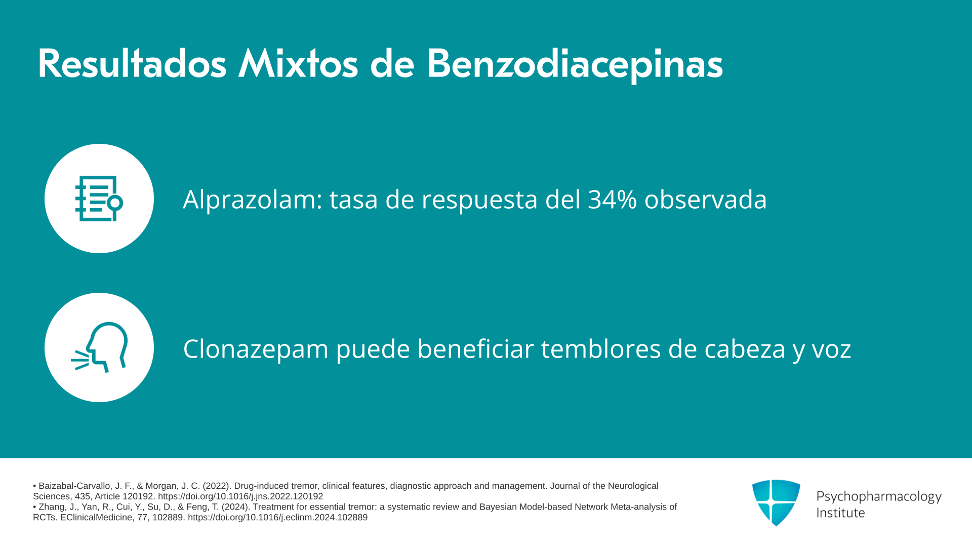 Las benzodiacepinas como clase tienen evidencia mixta. El alprazolam produjo una tasa de respuesta de aproximadamente 34% en dosis entre 0.75 mg y 3 mg diarios, mientras que el clonazepam tiene resultados variables, a veces beneficiando los temblores de cabeza, tronco y voz en dosis entre 0.5 mg y 6 mg diarios, o sin hacer ninguna diferencia apreciable, por lo que realmente tiene un perfil de respuesta bastante mixto.