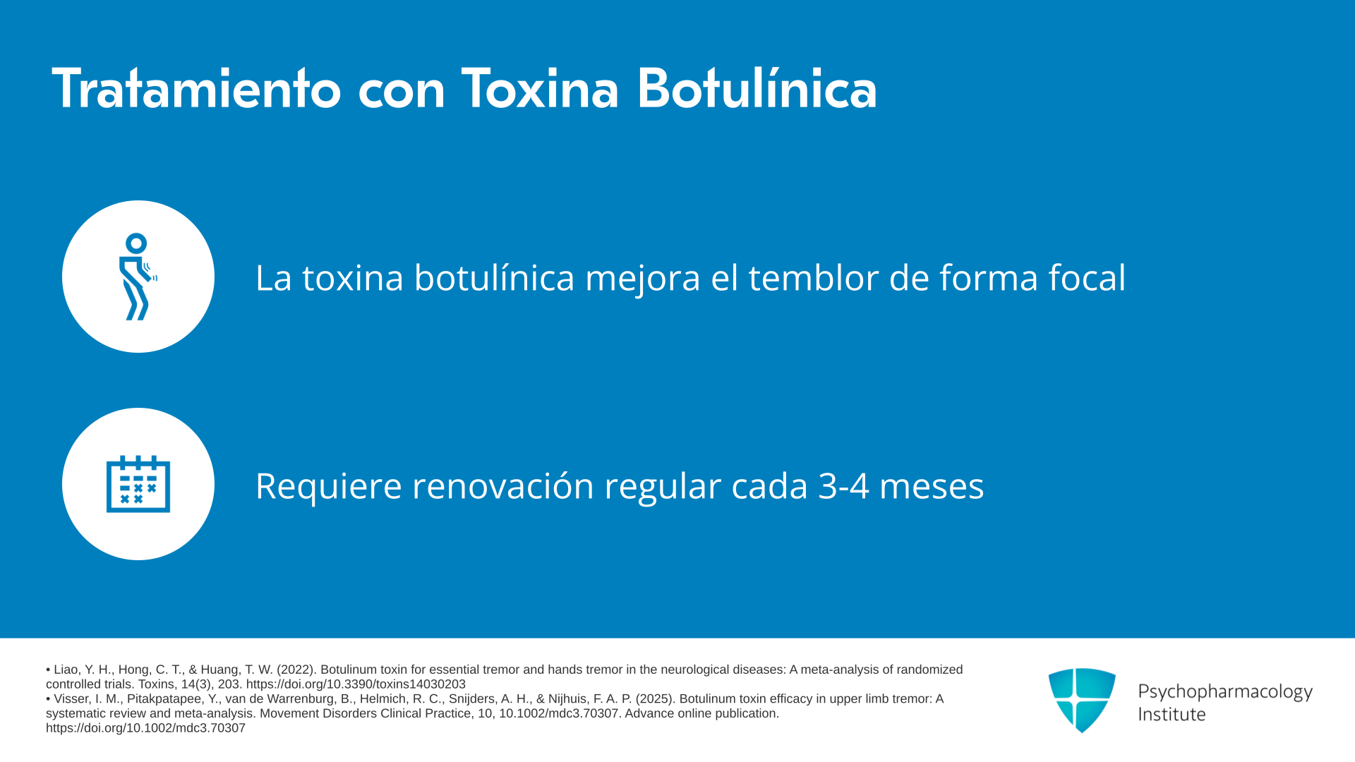 Finalmente, para ciertos casos, la toxina botulínica puede mejorar el temblor y lo hace de manera focal, localmente. Causa debilidad muscular como efecto primario, pero eso también puede reducir la amplitud del temblor y tiene que ser renovado. Tienen que recibir una nueva inyección de botulina cada tres o cuatro meses, pero he visto que esto se usa con buenos resultados en algunos casos.