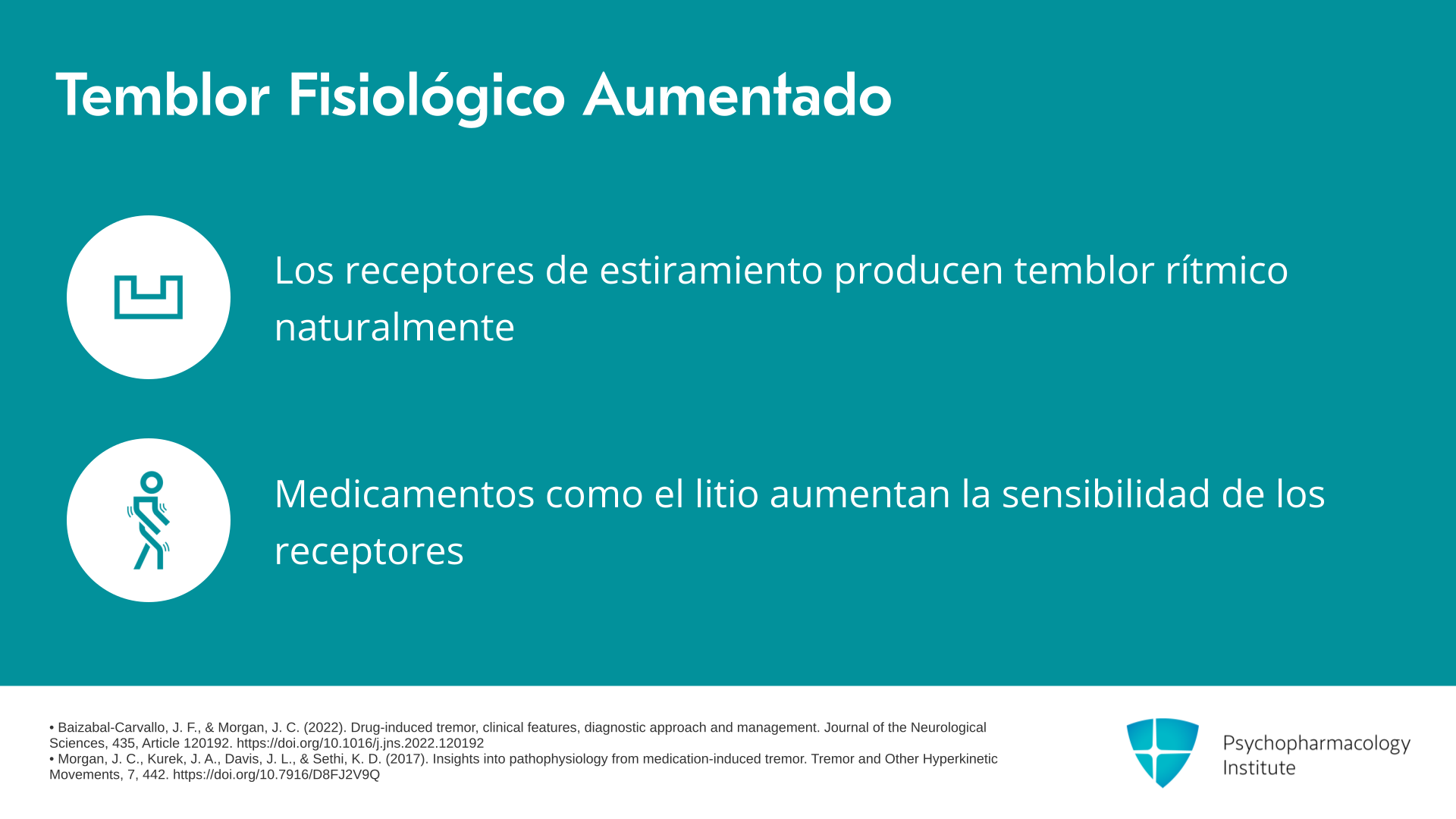 A veces, el mecanismo puede ser un temblor fisiológico aumentado. Los receptores de estiramiento en nuestra musculatura producen temblor rítmicamente en cierto grado para todos nosotros basado en muchos factores, pero medicamentos como el litio, por ejemplo, se cree que aumentan la sensibilidad de estos receptores de estiramiento y, por lo tanto, intensifican o empeoran el temblor fisiológico. Y así es como algunos de estos medicamentos pueden estar empeorando un temblor que ya está presente en la mayoría de nosotros.